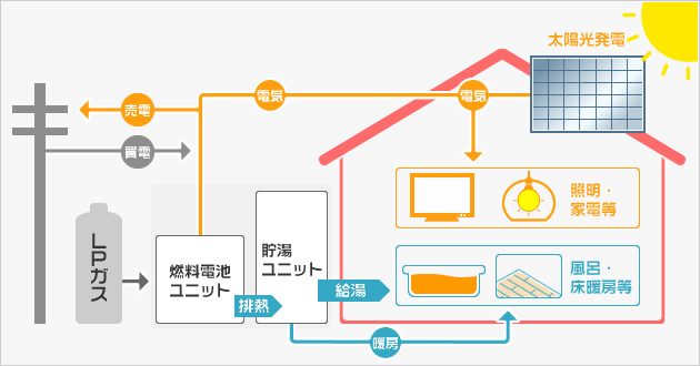 ![]() *停電時に外部から電力を受けるのではなく、発電している装置を停止しないでそのまま発電を継続させます。 バッテリーなどの外部電力を必要としないため、経済的です。 *エネファームが停電を感知すると、速やかに商用電力系統を切り離して、発電継続に必要なポンプやファンなどの補機に 必要な電力を供給しつつ、インバーターより外部の自立専用コンセントに電力を供給します。 *本機能は、200kwリン酸形燃料電池で実績のある自立制御技術を応用したものです。 *エネファームはガスを活用したマイホーム発電。省エネだから環境に優しく経済的。家中のエネルギーをまかないます。 *エネファームでつくった電気は、照明やテレビに。排熱で沸かしたお湯は、キッチンやお風呂などの給湯、床暖房や浴室 暖房乾燥機などにも使用出来ます。気軽に節電出来るのが、このエネファームです。 *発電所で発生する熱は、遠く離れた家庭に電気が運ばれてくるまでに送電ロスが発生します。エネファームなら、使う場所 で電気をつくるのでロスが少なく環境・省エネに優れています。
